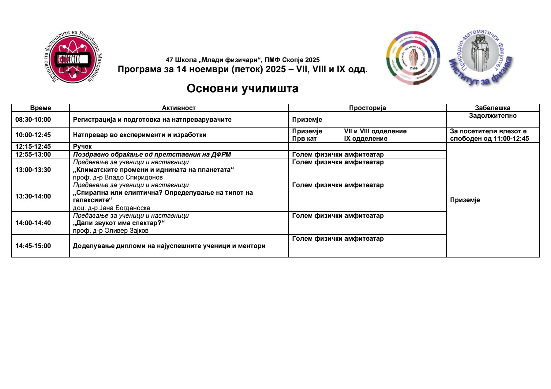 • ученици од основните училишта (седмо, осмо и деветто одделение) и нивните наставници по физика (петок, 14 ноември 2025 година)