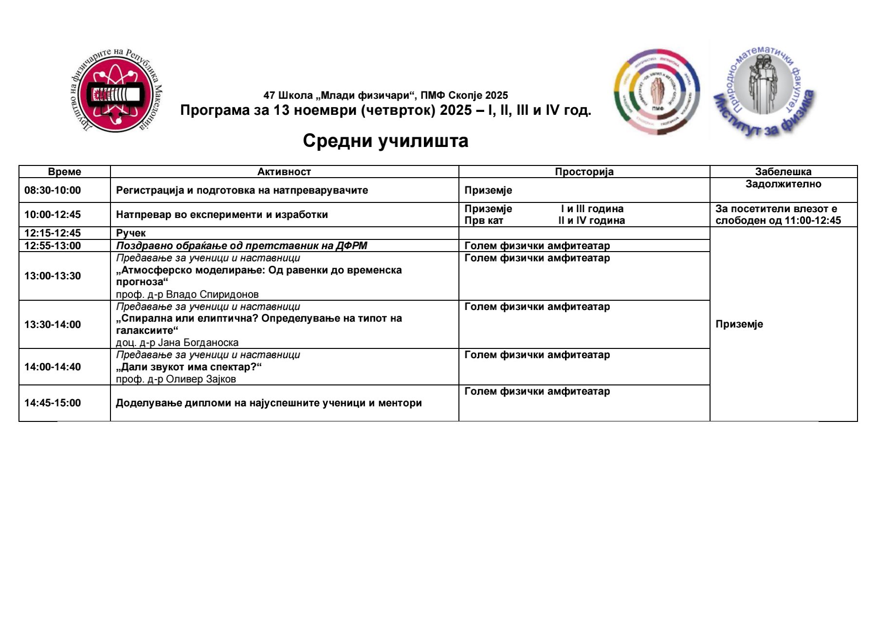 • ученици од средните училишта (сите години и струки) и нивните наставници по физика (четврток, 13 ноември 2025 година)